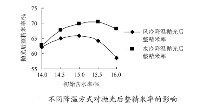 從圖中可知,在試驗參數范圍內,白米經過風冷卻降溫后再拋光,其整米率會隨著含水率的增加而呈現出先上升后下降的趨勢;而白米經過水冷卻降溫后再拋光,其整米率會隨著白米含水率的增加而呈現出先增加后減少的趨勢,且水冷卻降溫后白米的整米率明顯是高于風冷卻降溫方式的。